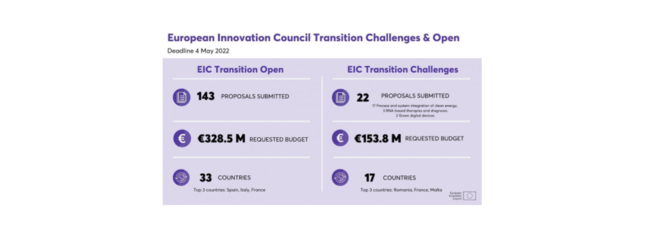 The European Commission’s European Innovation Council (EIC) received 165 proposals for the first 2022 cut-off of EIC Transition calls. EIC Transition projects focus on results generated by EIC Pathfinder, FET (Future and Emerging Technologies) or European Research Council (ERC) Proof of Concept projects, to mature the technologies and build a business case for specific applications. Grants of up to €2.5 million are available to validate and demonstrate technology in application-relevant environment and develop market readiness.