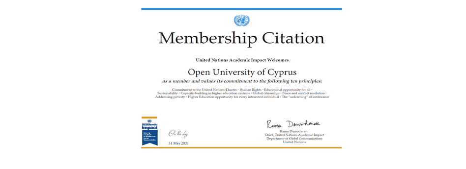 The Open University of Cyprus (OUC), in line with its commitment to social contribution, and to sustainable development at the local, national, and international levels, joins as a full member the United Nations Academic Impact (UNAI) network.