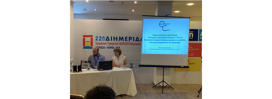 Το Ευρωπαϊκό Γραφείο Κύπρου συμμετείχε στην 22η διημερίδα τμημάτων/γραφείων Διεθνών, Δημοσίων Σχέσεων και Ευρωπαϊκών Προγραμμάτων των Ελληνικών Πανεπιστημίων, που πραγματοποιήθηκε στις 26, 27 και 28 Ιουνίου 2019 στη Λευκωσία.
